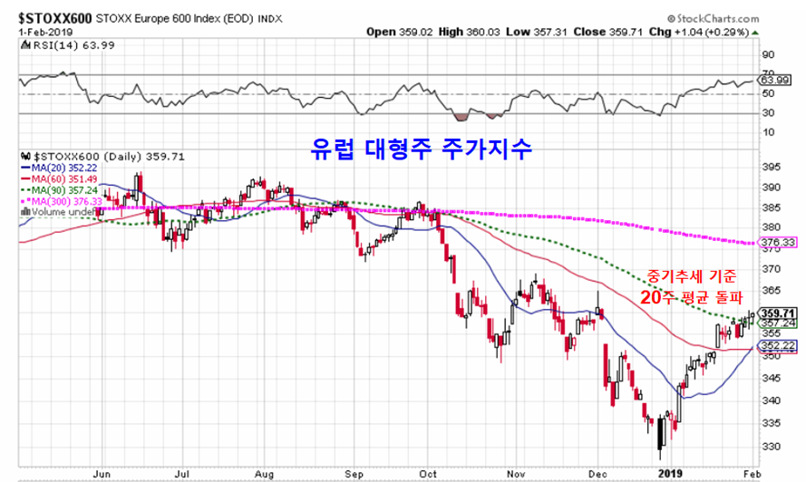 앞서서 달리는 신흥국 주가지수에 뒤쳐졌던 미국, 유럽, 그리고 중국의 주가지수가 1월 마지막주 중기 추세 기준인 20주 평균을 돌파하며 마감됨으로써 2월 장세가 보다 탄력적인 국면임을 예고하고 있다.