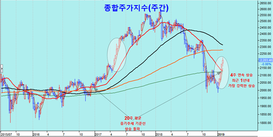 2019년 기해년 황금돼지해 주식 시장은 1월 4주 연속 상승을 하면서 최근 20개월 내 가장 강력한 상승 국면이 진행 중이다.