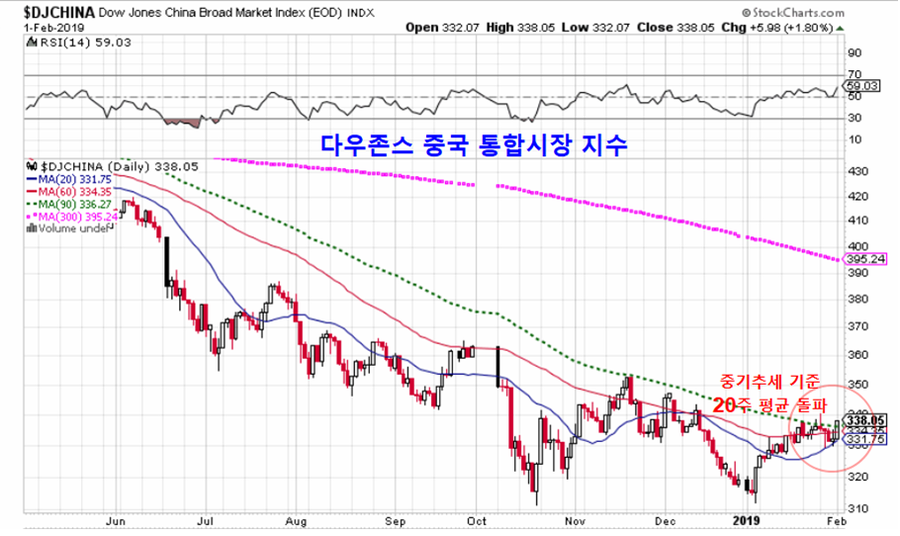 그러나 2월 첫날, 상승을 가로막던 20주 평균선을 돌파하며 마감함으로써 긴 체력비축기간을 마무리하고 상승이 시작됨을 알려준다. 춘절 연휴 이후 동절기 경기 동면에서 깨어나는 중국은 긴 춘절 연휴를 마감한 후 강력한 상승이 전개될 수 있음을 예고한다.