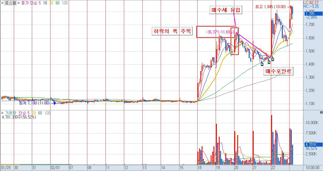 매수자리는 매수세 개입후 하락할때 와 하락이후 아침시초가부터 반전시 입니다.