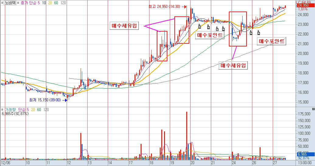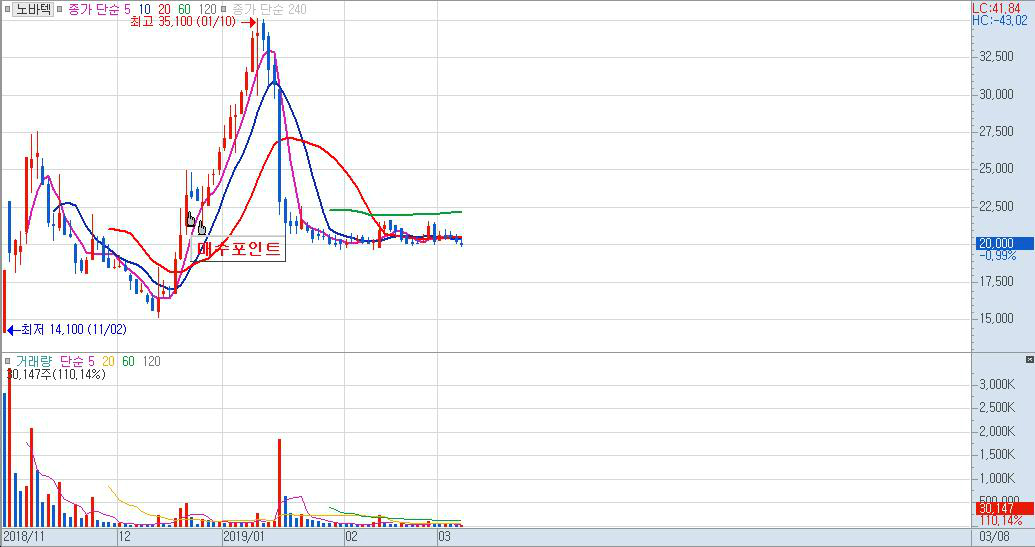 아래 노바텍의 케이스를 보면 신규상장주식이 조정을 받다가 새로운 매수세가