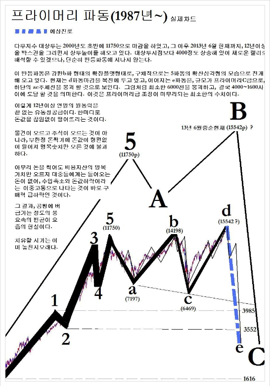 아래는 상기 프라이머리 파동의 그림을, 13년 6월 19일 오늘까지의 실제 차트와 그리고 예상 진행파동을 접목시켜놓았다.