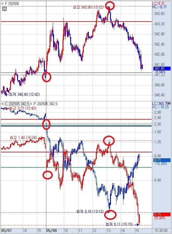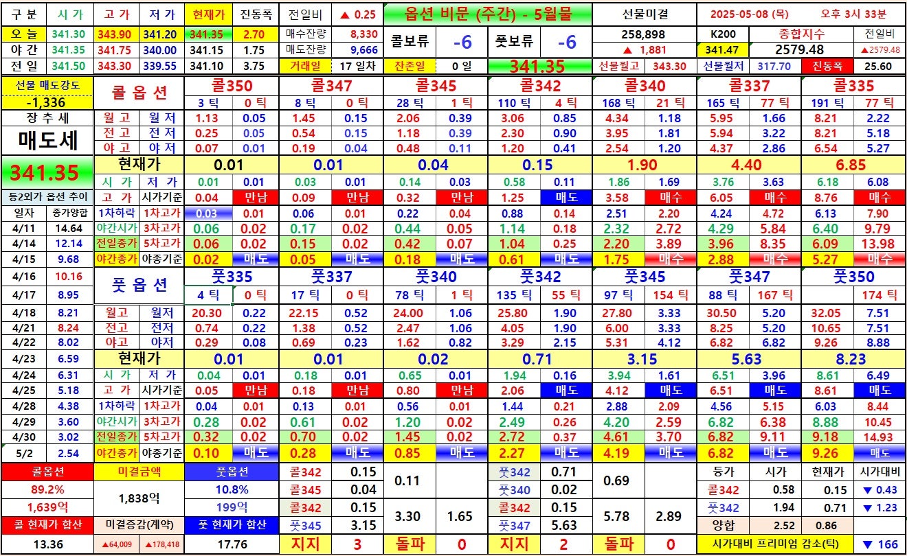 - 14시 30분 : 콜옵션 342 상대 월저 전저 1.90 회복 못함, 풋옵션 342 상대 장중저가 0.30 지지, 풋옵션 345 상대 월고 2.06 지지