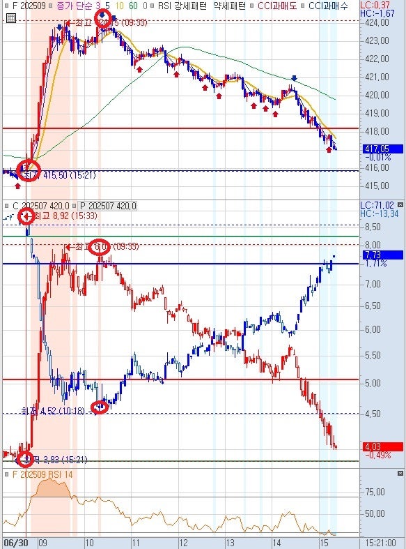 - 10시 30분 : 콜옵션 420 상대 장중고가 8.59 회복 못함, 풋옵션 420 상대 전고 야고 5.07~4.05 지지